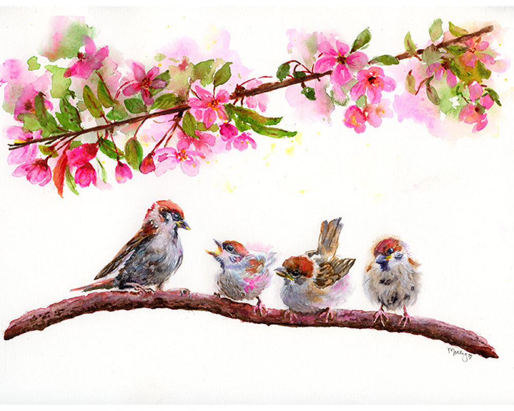 "Feed Me Mom" Birds on a Branch Watercolor Giclée Art Print by Molly's Fine Art
