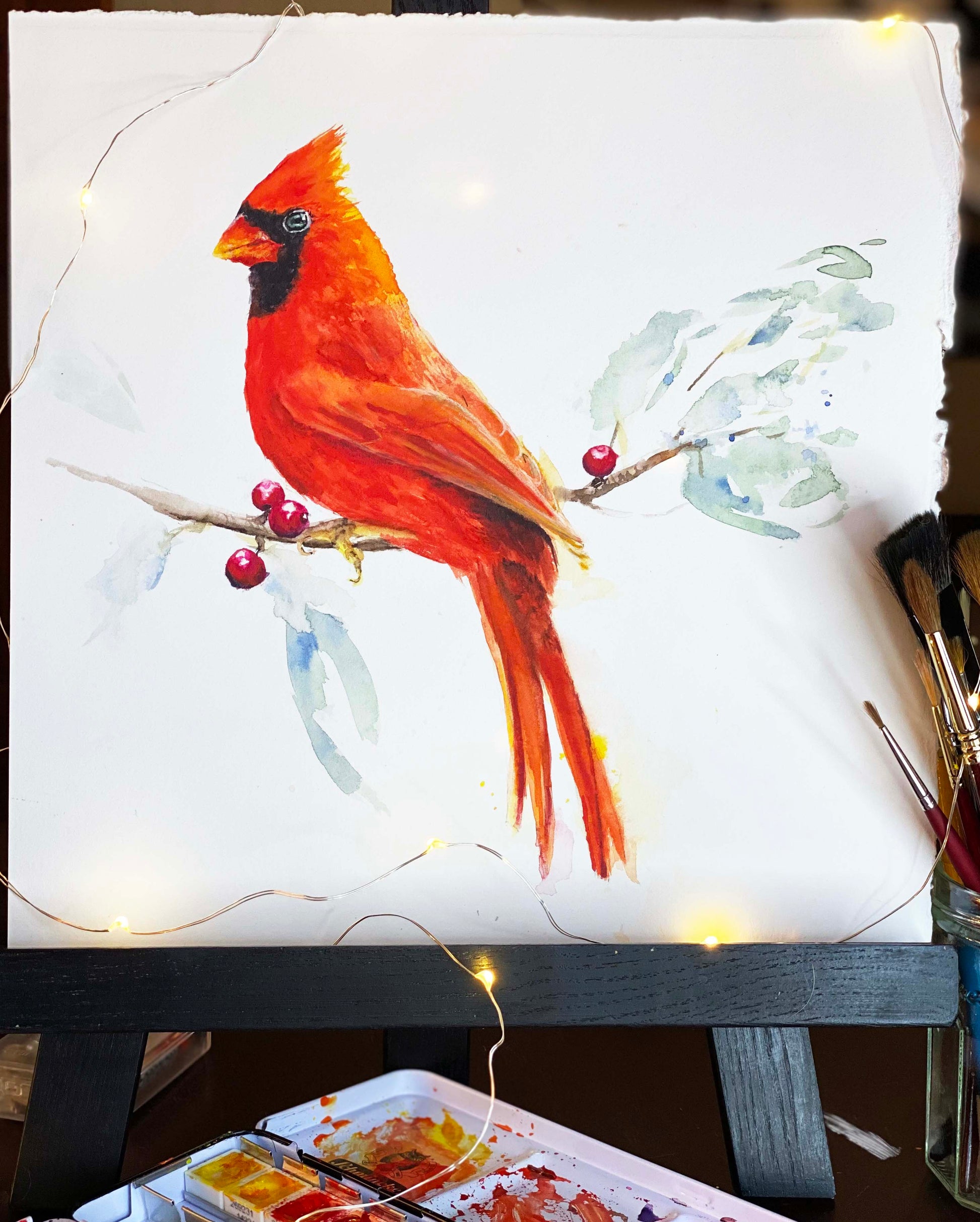 Bring the peaceful presence of a beautiful Cardinal to your home with a stunning watercolor print by Chicago-based artist Molly Walsh-Lorenzini of Molly's Fine Art. This watercolor artwork shows the Cardinal's striking appearance sitting on a branch with berries.